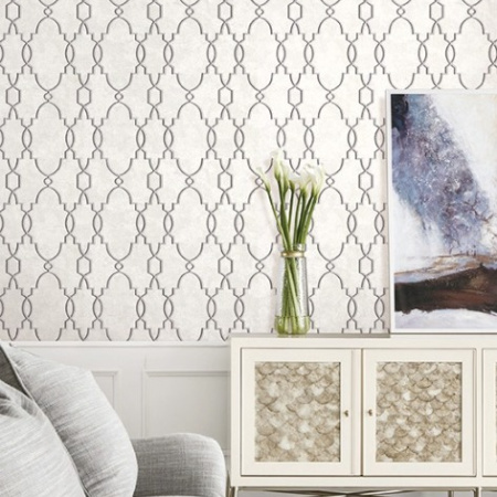 Решётка отлично сочетается с классическими полосами, дамасским узором, обоями под штукатурку и текстиль. Этот геометрический рисунок является универсальным и классическим вариантом для отделки стен.